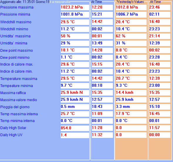 Massima pioggia per minuto (ultima ora)0.0 mm/min Massima pioggia per ora (ultime 6 ore)0.5 mm/ore